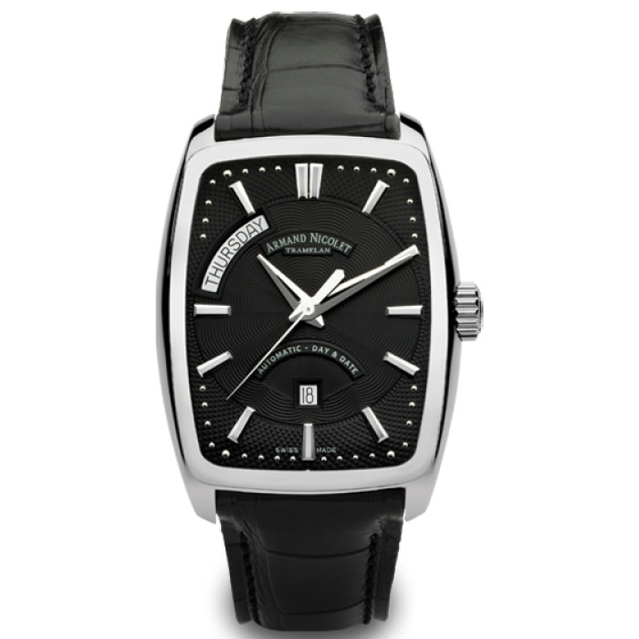 Размер: 53 х 38 мм. Механизм с автоподзаводом. Калибр AN 2834. Гильошированный циферблат. Окошко даты на 6 часов. Окошко дня недели. Прозрачная задняя крышка. Ремешок из кожи аллигатора с браслетной застежкой.