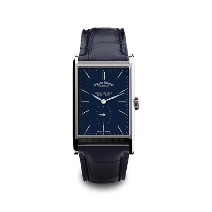 Размер: 48 мм х 29 мм. Толщина: 9 мм. Механизм с ручным заводом. Калибр AN0712A. Прозрачная задняя крышка корпуса. Синий циферблат с индексами. Синий ремешок из кожи аллигатора. Ограниченная серия 499 штук
