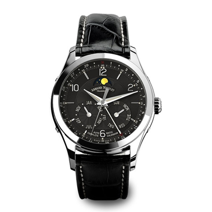 Диаметр: 43 мм. Толщина: 13 мм. Декорированный механизм с автоподзаводом. Калибр AN 9201/2846. Индикация даты, дня недели. Фаза луны. Гильошированный циферблат с накладными индексами и арабскими цифрами, светящиеся точки и стрелки. Прозрачная задняя крышка корпуса. Черный ремешок из кожи аллигатора с браслетной застежкой
