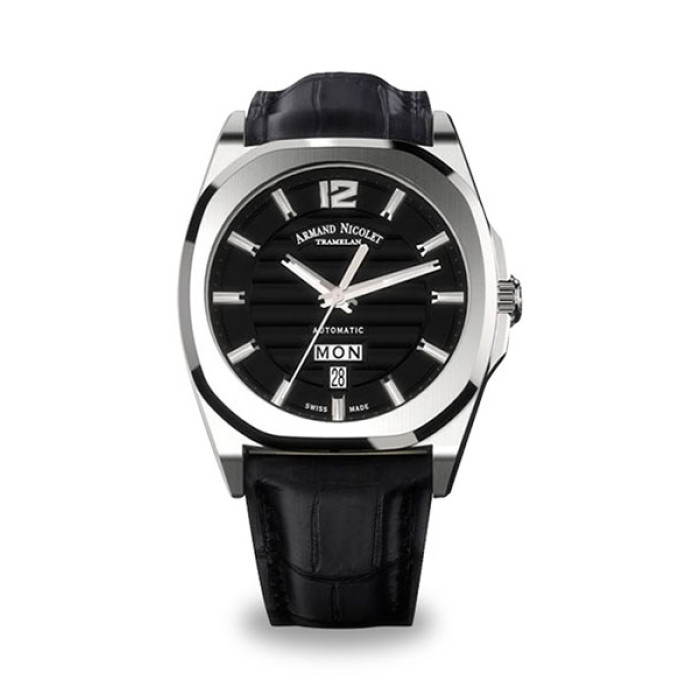 Диаметр: 41 мм. Толщина:15 мм. Механизм с автоподзаводом. Калибр 2846-9. Индикация даты, дня недели. Гильошированный циферблат со светящимися индексами и стрелками. Прозрачная задняя крышка корпуса. Черный ремешок из кожи аллигатора