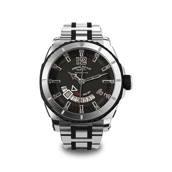 Диаметр: 44 мм. Толщина: 14 мм. Механизм с автоподзаводом. Калибр AN 2846-10. Индикация даты. Завинчивающаяся в корпус задняя крышка с рельефным рисунком. Циферблат с накладными светящимися индексами, цифрами и стрелками. Браслет: нержавеющая сталь 316L со звеньями из чёрной резины
