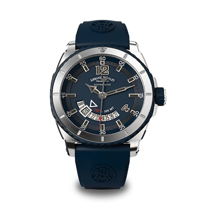Диаметр: 44 мм. Толщина: 14 мм. Механизм с автоподзаводом. Калибр AN 2846-10. Индикация даты. Завинчивающаяся в корпус задняя крышка с рельефным рисунком. Циферблат с накладными светящимися индексами, цифрами и стрелками. Синий резиновый ремешок с раскладывающейся застежкой