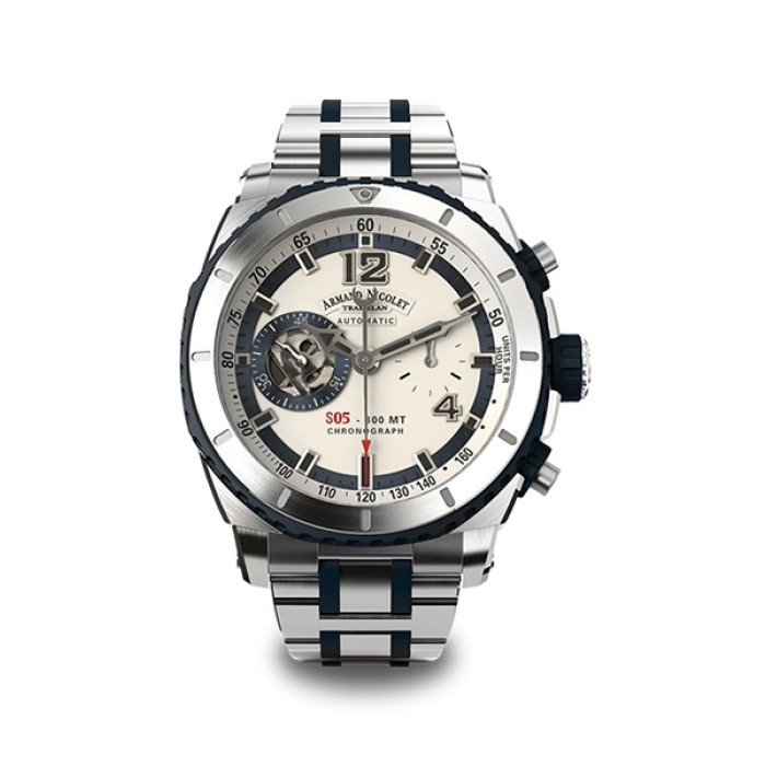 Диаметр: 44 мм. Толщина: 15,5 мм. Хронограф с автоподзаводом. Калибр AN 2045/2824-2. Циферблат с накладными светящимися индексами и цифрами и светящимися стрелками. Завинчивающаяся в корпус задняя крышка корпуса с рельефным рисунком. Браслет: нержавеющая сталь 316L со звеньями из синей резины