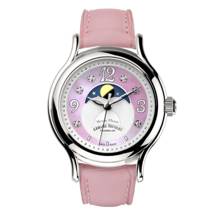 Armand Nicolet AL3 moon phase - элегантные женские часы, которые имеют самую романтичную часовую функцию - индикатор фазы луны. Часовые метки выполнены из брилиантов, а циферблат украшен вставками из перламутра. Использование перламутра делает часы уникальными, так как каждый кусочек этого природного материала обладает неповторимым узором. На заднюю крышку нанесена гравировка - изображение солнца. Часы на тонком ремешке из кожи в цвет циферблата, с удобной раскладной застёжкой.