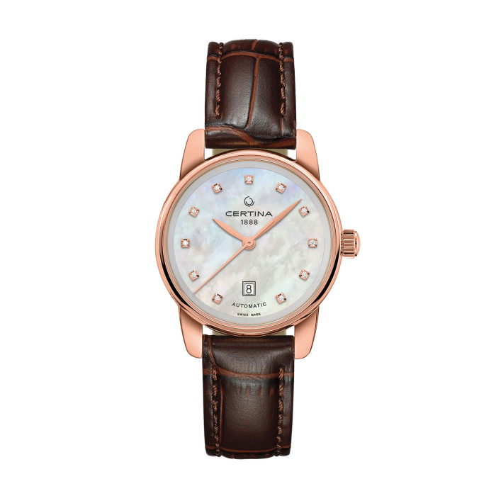 Диаметр корпуса: 29 мм. Механические часы с системой автоматического подзавода. Индикация часов, минут, секунд центральными стрелками. Окошко даты в положении 6 часов. Циферблат выполнен из натурального перламутра и украшен бриллиантами. Базель 2018.