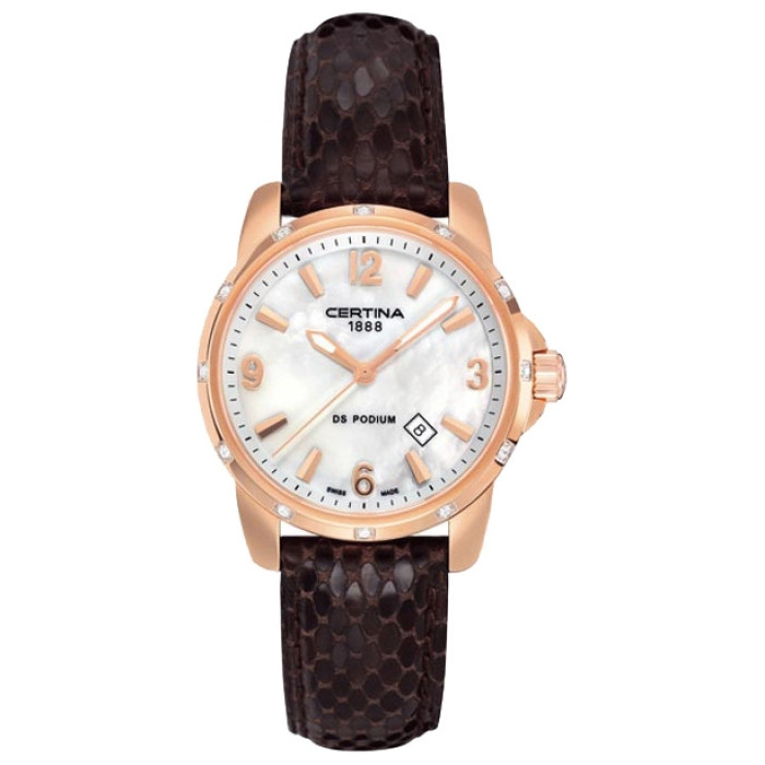 Диаметр корпуса: 32 мм. Корпус с 12 бриллиантами. Швейцарский кварцевый механизм ETA, калибр Trendline F06.161, на 3 камнях. Точность хода с погрешностью не более -10/+15 сек. в месяц. Центральные часовая, минутная и секундная стрелки. Большая индикация даты. Функция EOL - индикация низкого уровня заряда батареи при помощи движения секундной стрелки. Переводная коронка защищена от ударов выступами корпуса. Циферблат из натурального перламутра, аппликация часовых индексов и цифр с покрытием цвета золота или никелировкой. Стрелки и индексы с покрытием Super-LumiNova® Защелкивающаяся задняя крышка с гравированным логотипом бренда.