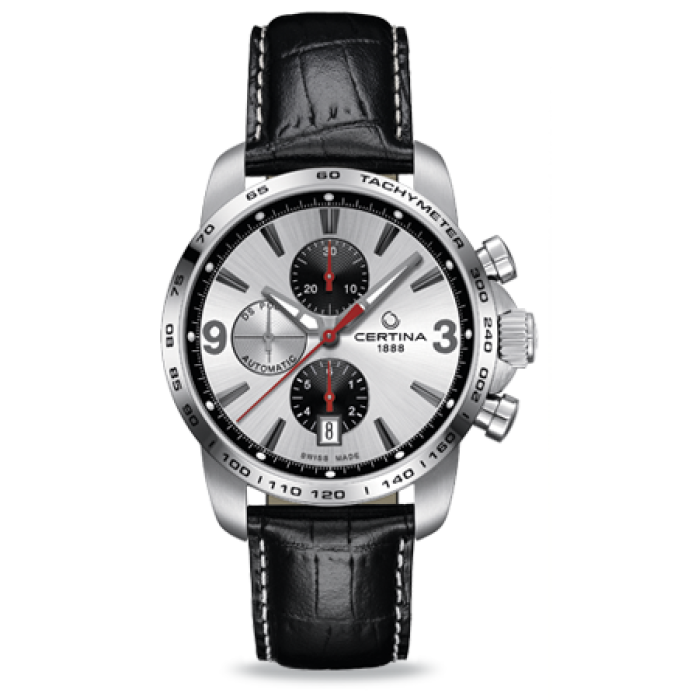 Диаметр корпуса: 42 мм. Швейцарский механизм с автоматическим подзаводом ETA, калибр C01.211. Запас хода 45 часов, частота колебаний баланса 21 600 пк/час, 15 камней. Центральные часовая и минутная стрелки, маленькие секунды на «9 часах». Апертура даты на «3 часах». Хронограф с центральной секундной стрелкой, 30-минутным и 6-часовым индикаторами на «12» и «6 часах» соответственно. Механизм персонализирован часовой маркой CERTINA. Безель с гравированной разметкой тахиметрической шкалы. Выступы корпуса защищают переводную коронку от случайных ударов. Циферблат с матовой шлифовкой, аппликация часовых индексов и цифр с алмазной огранкой.