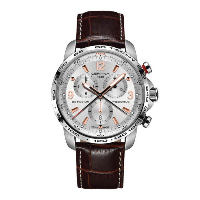Диаметр корпуса: 43 мм. BASEL 2016. Швейцарский кварцевый механизм ETA, калибр 251.264 AA PowerDrive & PreciDrive™, на 27 камнях. 5 шаговых электромоторов обеспечивают быструю работу механизма. Повышенная точность хода с погрешностью не более -/+10 секунд в год. Хронограф с функцией ADD и SPLIT, центральная секундная стрелка, 60-минутный и 12-часовой индикаторы на«2» и «10 часах» соответственно. Указатель 1/100 долей секунды при помощи дополнительной центральной стрелки. Центральные часовая и минутная стрелки, маленькие секунды на «6 часах». Индикация даты в апертуре на отметке «4 часах». Особая технология повышения надежности и защиты от проникновения влаги DS (Double Security) - специальное устойчивое к вибрации и ударам крепление механизма, дополнительные прокладки в конструкции заводной головки и сопряжении задней крышки и корпуса часов. Безель с гравированной разметкой тахиметрической шкалы. Выступы корпуса защищают переводную коронку от случайных ударов. Циферблат рельефный, с матовой поверхностью, аппликация цифр и элементов оформления. Стрелки и индексы с покрытием Super-LumiNova® Завинчивающаяся задняя крышка с гравированным логотипом бренда. Кожаный ремешок с тиснением «под аллигатора», браслетная застежка тройного сложения типа «бабочка», раскладывающаяся при нажатии на кнопки.