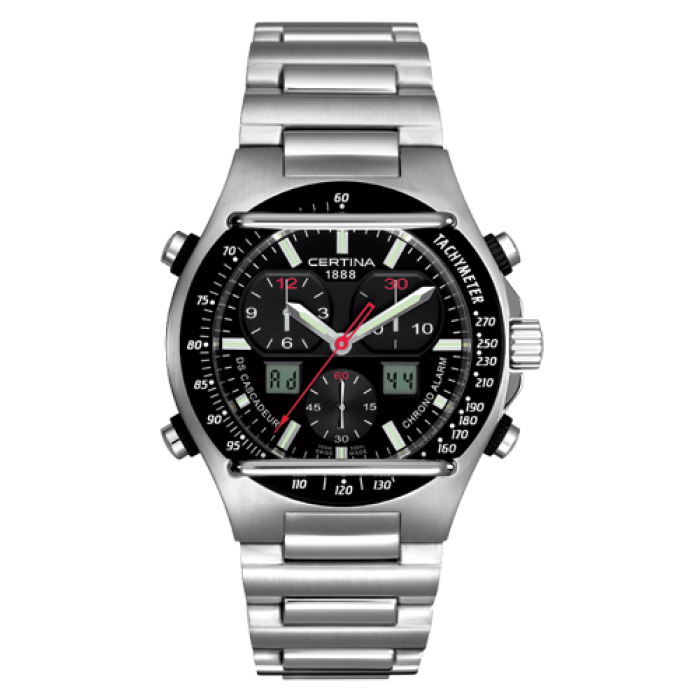 Диаметр корпуса: 43 мм. Точный кварцевый механизм хронографа. Смещенная секундная стрелка. Календарь, будильник. Точность хода не хуже -10 +15 сек./в месяц. Светонакопительный состав на стрелках.
