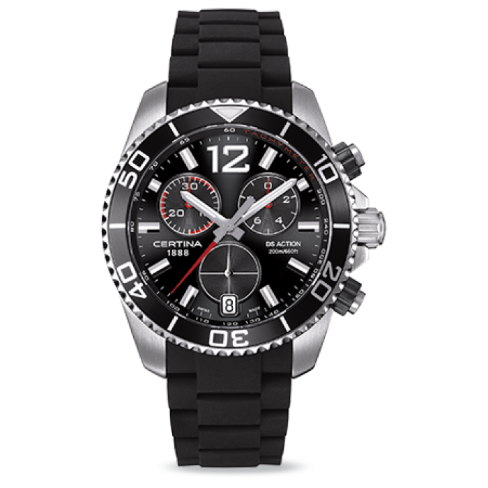 Диаметр корпуса: 42,5 мм. Точность хода с погрешностью не более -10/+15 секунд в месяц. Элемент питания №394 со сроком службы 38 месяцев. Хронограф с функцией ADD и SPLIT, центральная секундная стрелка, 30-минутный индикатор и указатель 1/10 долей сек. на«2 часах». Центральные часовая и минутная стрелки, маленькие секунды на «6 часах». Индикация даты в апертуре на отметке «6 часов». Особая технология повышения надежности и защиты от проникновения влаги DS+ (Double Security) – специальное устойчивое к вибрации и ударам крепление механизма, завинчивающаяся заводная головка с дополнительными прокладками увеличивающими герметичность, резьбовое соединение задней крышки и корпуса со скрытыми герметичными прокладками. Поворотный безель с покрытием и крупной разметкой вращается «щелчками» против хода стрелок. Циферблат в спортивном стиле, аппликация крупных часовых индексов. Стрелки и индексы с покрытием Super-LumiNova®. Завинчивающаяся задняя крышка с гравированным логотипом бренда и заводная коронка с винтовой фиксацией. Рельефный браслет из каучука, специальная дайверская застежка с защитным фиксатором и удлинителем для ношения поверх гидрокостюма.