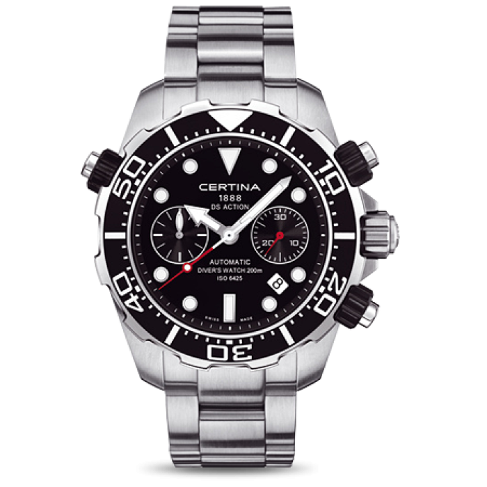 Диаметр корпуса: 45 мм. Брутальный мужской хронограф с 60-ти секундным и 30-ти минутным счетчиками, индикация даты между "4" и "5" часами, вынесенная секундная стрелка на "9" часов, , люминесцентное покрытие индексов и стрелок, вращающийся однонаправленный безель, завинчивающаяся заводная коронка.