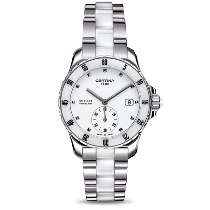 Диаметр корпуса: 34,8 мм. Швейцарский кварцевый механизм ETA с аналоговой индикацией. Точность хода с погрешностью не более -10/+15 сек. в месяц. Центральная часовая и минутная стрелки, маленький секундный индикатор смещен на отметку «6 часов». Индикация даты. Безель с керамической вставкой и контрастной разметкой. Циферблат в спортивном стиле, аппликация часовых индексов. Переводная коронка украшена кабошоном. Стрелки и индексы с покрытием Super-LumiNova®. Захлопывающаяся задняя крышка с гравированным логотипом бренда. Браслет с центральными звеньями из керамики, внешние литые звенья из нерж. стали, браслетная застежка, раскладывающаяся при нажатии на кнопки.