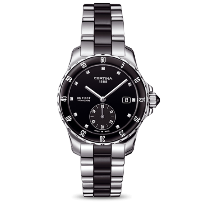Диаметр корпуса: 34,8 мм. Швейцарский кварцевый механизм ETA с аналоговой индикацией. Точность хода с погрешностью не более -10/+15 сек. в месяц. Центральная часовая и минутная стрелки, маленький секундный индикатор смещен на отметку «6 часов». Индикация даты. Безель с керамической вставкой и контрастной разметкой. Циферблат в спортивном стиле, аппликация часовых индексов. Переводная коронка украшена кабошоном. Стрелки и индексы с покрытием Super-LumiNova®. Захлопывающаяся задняя крышка с гравированным логотипом бренда. Браслет с центральными звеньями из керамики, внешние литые звенья из нерж. стали, браслетная застежка, раскладывающаяся при нажатии на кнопки.