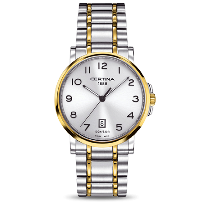 Диаметр корпуса: 38 мм. Индикация даты. Кварцевые часы Certina. Особая технология повышения надежности и защиты от проникновения влаги DS (Double Security) - специальное устойчивое к вибрации и ударам крепление механизма, дополнительные прокладки в конструкции заводной головки и сопряжении задней крышки и корпуса часов. Высокопрочное антибликовое сапфировое стекло.