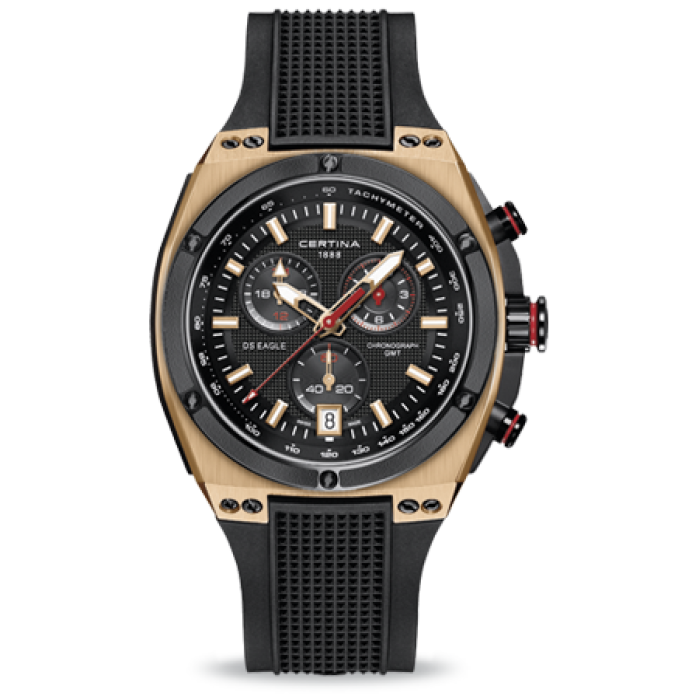 Диаметр корпуса: 46 мм. Швейцарский кварцевый механизм ETA, калибр G10.961, на 4 камнях. Точность хода с погрешностью не более -10/+15 секунд в месяц. Хронограф с функцией ADD и SPLIT, центральная секундная стрелка, 60-минутный и 12-часовой индикаторы на«2 часах». Индикатор времени второго часового пояса GMT в 24-часовом формате на отметке «10 часов». Центральные часовая и минутная стрелки, маленькие секунды на «6 часах». Индикация даты в апертуре на отметке «6 часов». Функция EOL - индикация низкого уровня заряда батареи при помощи движения секундной стрелки. Безель с рельефной поверхностью черного цвета крепится к корпусу декоративными винтами с шестигранным шлицом. Выступы корпуса защищают переводную коронку от случайных ударов. Циферблат с гильошированием, рельефная шкала с часовыми метками, яркие акценты красного или зеленого цветов. Стрелки и индексы с покрытием Super-LumiNova®. Задняя крышка с гравированным объемным изображением черепахи – логотипа марки CERTINA крепится к корпусу 4 винтами. Каучуковый ремешок с тиснением, объемная литая застежка с шипом.