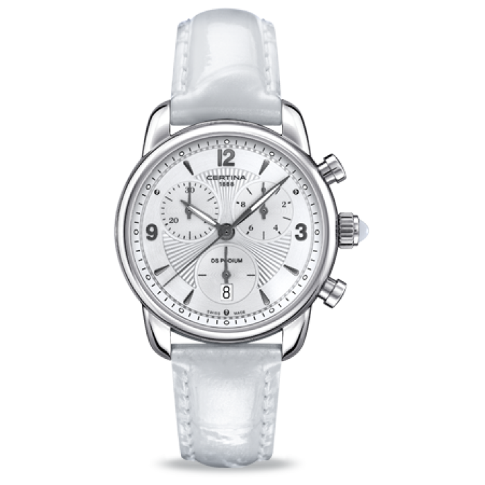 Диаметр корпуса: 34,5 мм. Швейцарский кварцевый механизм. Точность хода с погрешностью не более -12/+18 секунд в месяц. Хронограф с функцией ADD и SPLIT, центральная секундная стрелка, 30-минутным и 1/10-секундным индикаторами на «10» и «2 часах» соответственно. Центральные часовая и минутная стрелки, маленькие секунды на «6 часах». Индикация даты в апертуре на «6 часах». Выступы корпуса защищают переводную коронку от случайных ударов. Переводная коронка украшена кабошоном. Циферблат с гильошированием, аппликация часовых индексов с алмазной огранкой или рисованные римские цифры. Стрелки и индексы с покрытием Super-LumiNova® Защелкивающаяся задняя крышка с гравированным логотипом бренда.