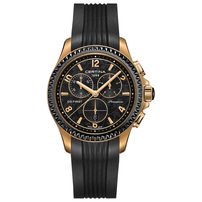 Диаметр корпуса: 38 мм. Швейцарский кварцевый механизм ETA, калибр G15.212 AA PreciDrive™, на 6 камнях. Повышенная точность хода с погрешностью не более -/+10 секунд в год. Хронограф с функцией ADD и SPLIT, центральная секундная стрелка, 30-минутным и 1/10-секундным индикаторами на «9» и «3 часах» соответственно. Центральные часовая и минутная стрелки, маленькие секунды на «6 часах». Индикация даты в апертуре на «6 часах». Циферблат с лакированной поверхностью, аппликация часовых индексов и цифр с покрытием цвета золота или никелировкой и алмазной огранкой. Переводная коронка украшена кабошоном. Выступы корпуса защищают переводную коронку от случайных ударов. Захлопывающаяся задняя крышка с гравированным логотипом бренда.