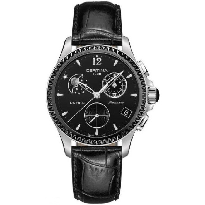 Диаметр корпуса: 38 мм. Базель 2016. Швейцарский кварцевый механизм ETA, калибр G10.962 BH PreciDrive™, на 4 камнях. Повышенная точность хода с погрешностью не более -/+10 секунд в год. Индикатор лунных фаз на отметке «10 часов». Хронограф с функцией ADD и SPLIT, центральная секундная стрелка, 60-минутный индикатор на «2 часах». Центральные часовая и минутная стрелки, маленькие секунды на «6 часах». Индикация даты в апертуре на «4 часах». Безель из керамики с ребристой насечкой. Сапфировое стекло повышенной стойкостью к возникновению царапин. Циферблат с лакированной поверхностью, аппликация часовых индексов и цифр, инкрустация бриллианта в виде стилизованной «счастливой звезды» над апертурой фаз Луны. Переводная коронка украшена керамическим кабошоном. Выступы корпуса защищают переводную коронку от случайных ударов. Захлопывающаяся задняя крышка с гравированным логотипом бренда.