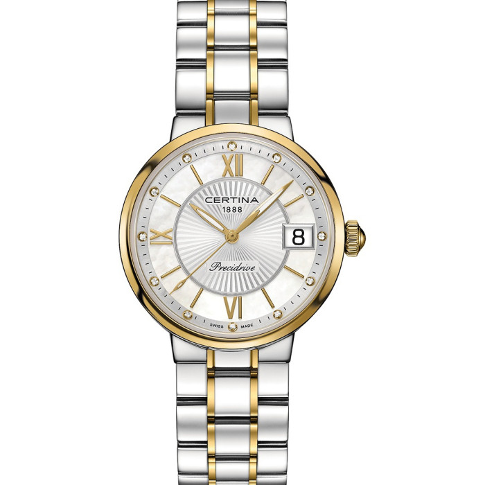 Диаметр корпуса: 32 мм. Вставка: 12 бриллиантов. Индикация даты на "3" часа, люминесцентное покрытие часовой и минутной стрелок.