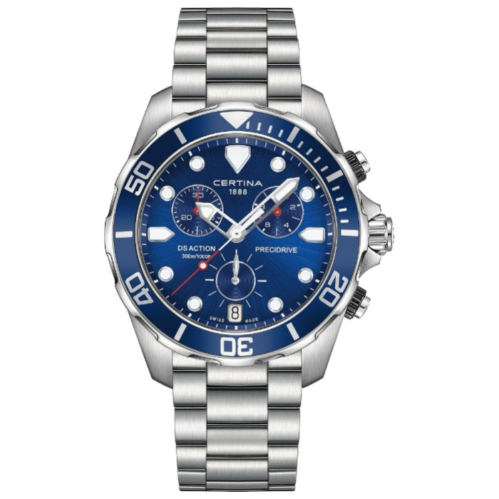 Диаметр корпуса: 43 мм. Повышенная точность хода с погрешностью не более -/+10 секунд в год. Элемент питания №394 со сроком службы 38 месяцев. Хронограф с функцией ADD и SPLIT, центральная секундная стрелка и 30-минутный индикатор на «10 часах», указатель 1/10 долей секунды при помощи маленькой стрелки на «2 часах». Центральные часовая и минутная стрелки, маленькие секунды на «6 часах». Индикация даты в апертуре на отметке «4 часах». Функция EOL - индикация низкого уровня заряда батареи при помощи движения секундной стрелки. Особая технология повышения надежности и защиты от проникновения влаги DS+ (Double Security) – специальное устойчивое к вибрации и ударам крепление механизма, завинчивающаяся заводная головка с дополнительными прокладками увеличивающими герметичность, резьбовое соединение задней крышки и корпуса со скрытыми герметичными прокладками. Поворотный безель с покрытием и крупной разметкой вращается «щелчками» против хода стрелок. Циферблат в водолазном стиле, аппликация крупных часовых индексов. Стрелки и индексы с покрытием Super-LumiNova®. Завинчивающаяся задняя крышка с гравированным логотипом бренда и заводная коронка с винтовой фиксацией. Браслет с литыми звеньями из нерж. стали, специальная дайверская застежка с удлинителем для ношения поверх гидрокостюма, раскладывающаяся при нажатии на кнопки. Специальная дайверская застежка с удлинителем для ношения поверх гидрокостюма, раскладывающаяся при нажатии на кнопки.