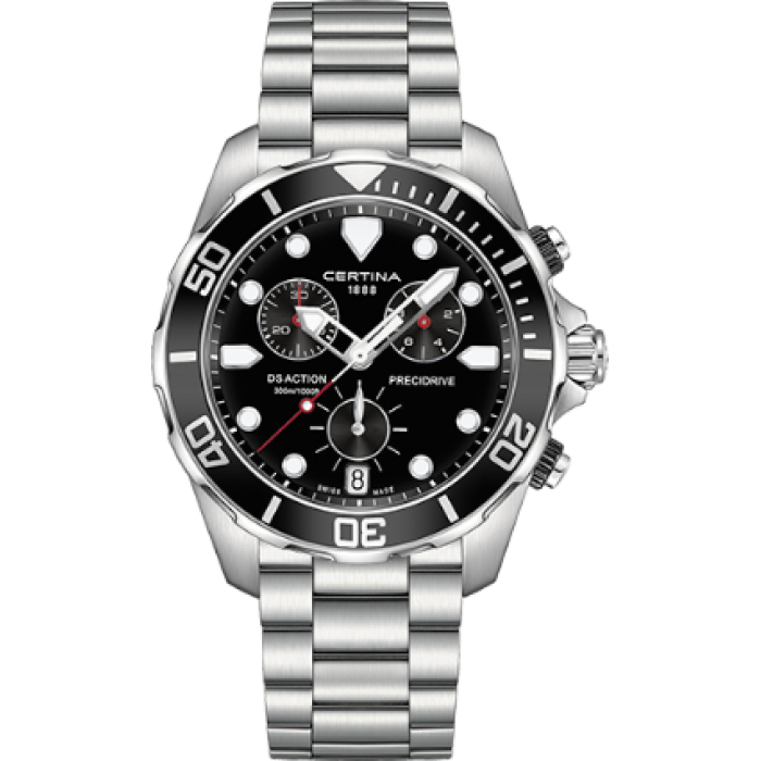 Диаметр корпуса: 43 мм. Повышенная точность хода с погрешностью не более -/+10 секунд в год. Элемент питания №394 со сроком службы 38 месяцев. Хронограф с функцией ADD и SPLIT, центральная секундная стрелка и 30-минутный индикатор на «10 часах», указатель 1/10 долей секунды при помощи маленькой стрелки на «2 часах». Центральные часовая и минутная стрелки, маленькие секунды на «6 часах». Индикация даты в апертуре на отметке «4 часах». Функция EOL - индикация низкого уровня заряда батареи при помощи движения секундной стрелки. Особая технология повышения надежности и защиты от проникновения влаги DS+ (Double Security) – специальное устойчивое к вибрации и ударам крепление механизма, завинчивающаяся заводная головка с дополнительными прокладками увеличивающими герметичность, резьбовое соединение задней крышки и корпуса со скрытыми герметичными прокладками. Поворотный безель с покрытием и крупной разметкой вращается «щелчками» против хода стрелок. Циферблат в водолазном стиле, аппликация крупных часовых индексов. Стрелки и индексы с покрытием Super-LumiNova®. Завинчивающаяся задняя крышка с гравированным логотипом бренда и заводная коронка с винтовой фиксацией. Браслет с литыми звеньями из нерж. стали, специальная дайверская застежка с удлинителем для ношения поверх гидрокостюма, раскладывающаяся при нажатии на кнопки. Специальная дайверская застежка с удлинителем для ношения поверх гидрокостюма, раскладывающаяся при нажатии на кнопки.