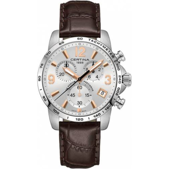 Диаметр корпуса: 41 мм. Швейцарский кварцевый механизм. Повышенная точность хода с погрешностью не более -/+10 секунд в год. Хронограф с функцией ADD и SPLIT, центральная секундная стрелка и 30-минутный индикатор на «10 часах», указатель 1/10 долей секунды при помощи маленькой стрелки на «2 часах». Центральные часовая и минутная стрелки, маленькие секунды на «6 часах». Индикация даты в апертуре на отметке «4 часах». Функция EOL - индикация низкого уровня заряда батареи при помощи движения секундной стрелки. Стойкое PVD-покрытие цвета на безеле, переводной коронке и кнопках хронографа. Особая технология повышения надежности и защиты от проникновения влаги DS (Double Security) - специальное устойчивое к вибрации и ударам крепление механизма, дополнительные прокладки в конструкции заводной головки и сопряжении задней крышки и корпуса часов. Безель с контрастным покрытием и гравированной разметкой тахиметрической шкалы. Выступы корпуса защищают переводную коронку от случайных ударов. Циферблат рельефный, с матовой поверхностью, аппликация цифр и элементов оформления.