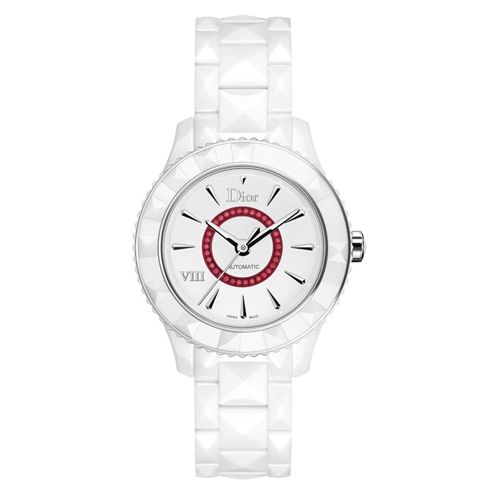 Серебристый опаловый циферблат, центральное кольцо из алюминия с красным покрытием и рубинами |
