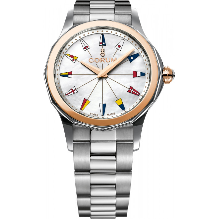 Кварцевый механизм калибра CO 020. Двенадцатигранный стальной корпус диаметром 32 мм. Безель из 18К розового золота. Сапфировое стекло с двойным антибликовым покрытием. Водозащита до 50 м. Перламутровый циферблат, украшенный морскими сигнальными флажками. Стальной браслет.