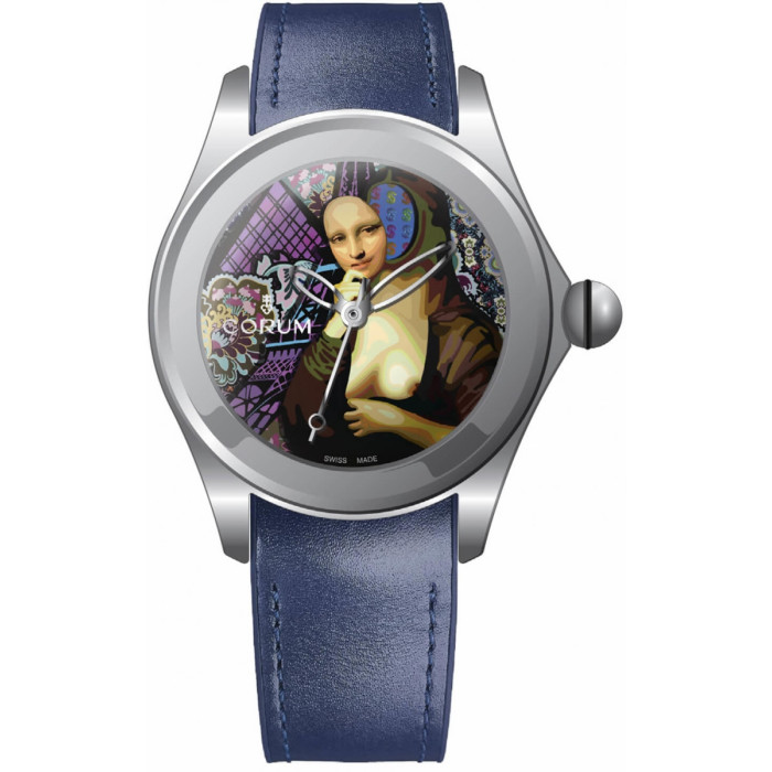 Механизм с автоподзаводом калибра CO 082. Запас хода 42 часов. 28800 полуколебаний/час, 21 камень. Стальной корпус диаметром 47 мм и толщиной 18,50 мм. Выпуклое сапфировое стекло с двойным антибликовым покрытием, прозрачная задняя крышка из сапфирового стекла. Водозащита до 100 м. Часы Bubble 47 являются результатом партнерства Corum c многогранной канадской художницей Элизабетт Фантоне, создающей лимитированные серии с необычным и притягательным дизайном. Циферблат этой модели Bubble украшает изображение одной из ее работ. Ограниченная серия 88 экземпляров. Синий комбинированный ремешок из каучука и телячьей кожи, застежка-пряжка.