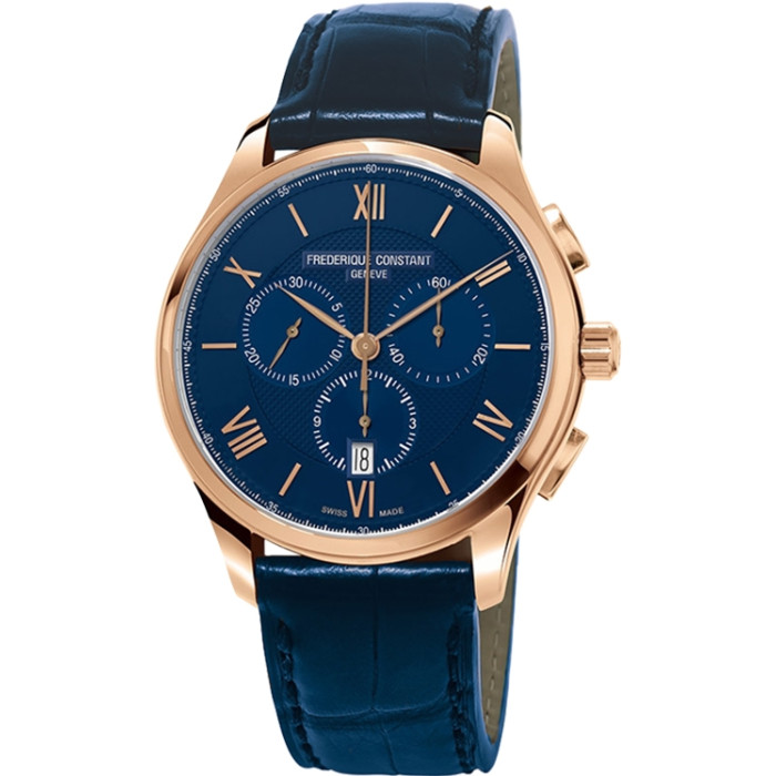 Модель Frederique Constant FC-292MN5B4 с кожаным ремешком темно-синего цвета с тиснением напоминающим кожу крокодила. Стандартная застежка - пряжка из нержавеющей стали с позолотой, гравировка с логотипом швейцарской марки.