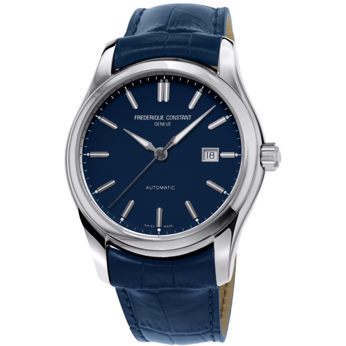 Модель Frederique Constant FC-303NN6B6 с ремешком темно-синего цвета из высококачественной кожи с тиснением под аллигатора. Ремешок вплотную прилегает к корпусу и имеет ширину 23 мм. Литая классическая застежка из нержавеющей стали с гравировкой с эмблемы часовой марки.