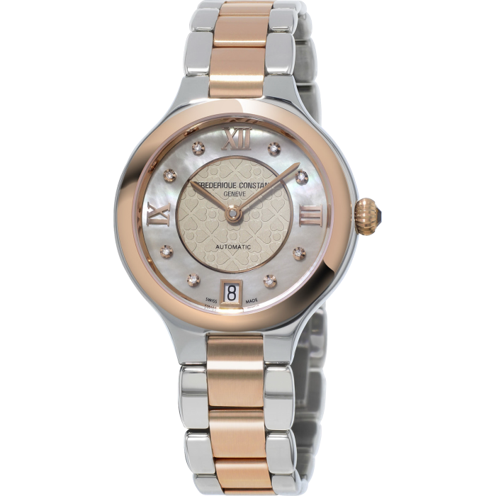 Classics Delight Automatic Элегантная женская классика. Часовая и минутная стрелки из воронёной стали. Циферблат выполнен из натурального перламутра с 8 бриллиантами и с узором гильоше по центру. Окошко даты в положении 6 часов.
