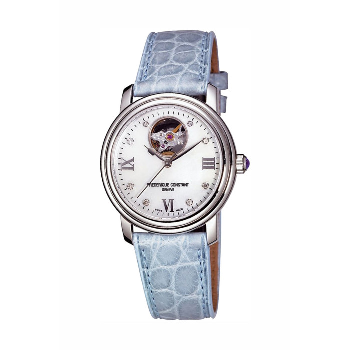 Модель Frederique Constant FC-310MPWD2P6 с ремешком голубого цвета из кожи аллигатора. Браслетная застежка из нержавеющей стали, раскладывающаяся при нажатии на кнопки двойной блокировки, с ажурной эмблемой этой швейцарской марки.