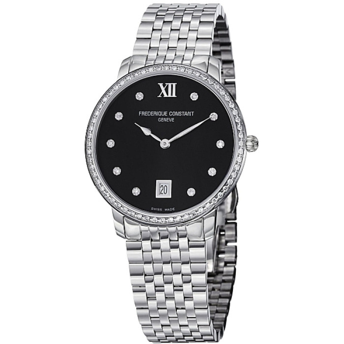 Швейцарские часы Frederique Constant Slimline FC-220WHD2ECD6B, предназначенные для женщин, являются идеальным воплощением элегантности, роскоши и традиционного стиля. Тонкий корпус Frederique Constant Slimline из высококачественной стали дополнен литым браслетом, безель и циферблат украшены драгоценными камнями.