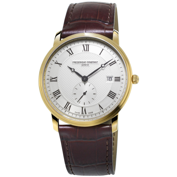 Модель Frederique Constant FC-245M5S5 на кожаном ремешке красно-коричневого цвета, стилизованным под кожу крокодила. Классическая застежка пряжка с шипом изготовлена из стали с позолотой и украшена гравированной эмблемой марки.