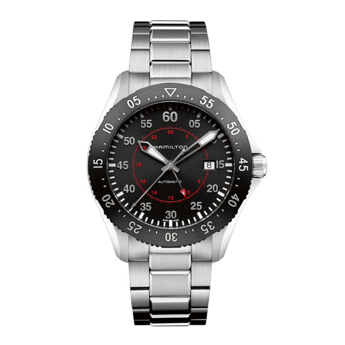 Диаметр корпуса: 44 мм. Механический с автоподзаводом. Дата, второй часовой пояс (GMT), двунаправленно вращающийся безель, прозрачная задняя крышка.