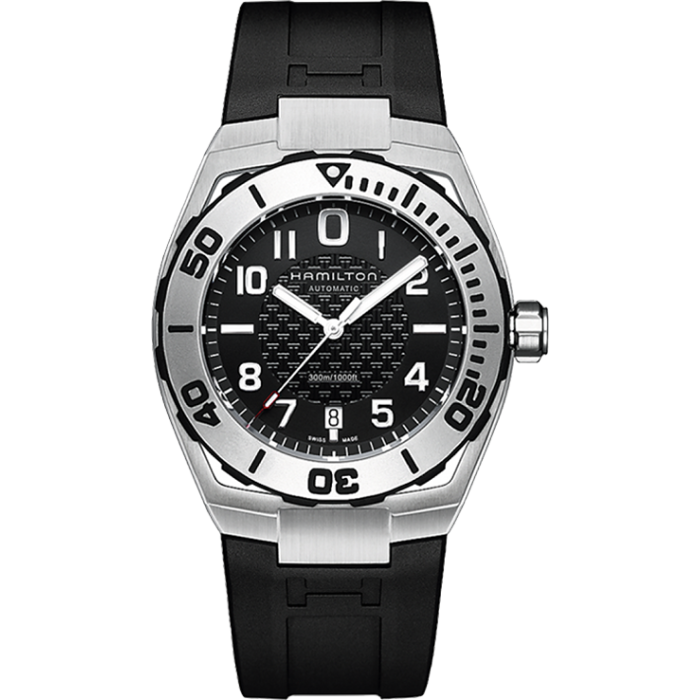 Khaki Navy Sub Auto Современные часы в морском стиле, их дополняет рельефное изображение морского ската на задней крышке и элегантно-броским безелем.