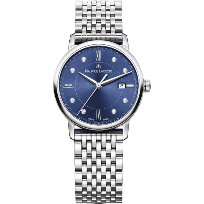 Элегантная женская модель с индикацией даты в положении 3 часа, циферблат часов украшен 8 бриллиантами общим весом 0.04 ct