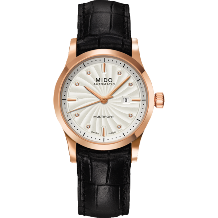 Женские часы. Индикация часов, минут, секунд центральными стрелками. Окошко даты в положении 3 часа. Циферблат украшен узором гильоше и бриллиантами.