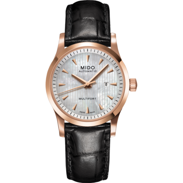 Женские часы. Индикация часов, минут, секунд центральными стрелками. Окошко даты в положении 3 часа. Циферблат украшен узором гильоше и натуральным перламутром.