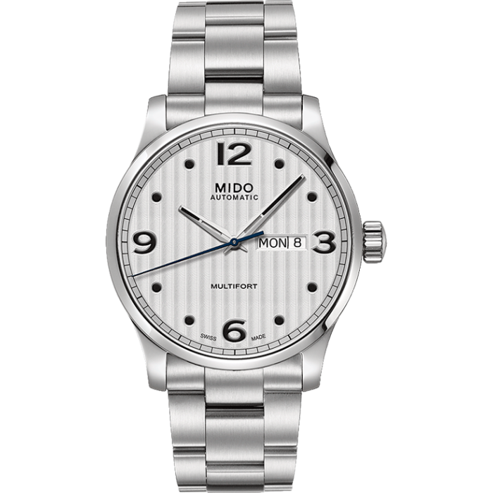 Mido Multifort Классические мужские часы. Необычный гильошированный циферблат притягивает внимание. Надёжный механизм может показать не только стандартное время, но и день недели с числом в специальном окошке на отметке "3" часов. Данная модель станет верным спутником на Вашем запястье.