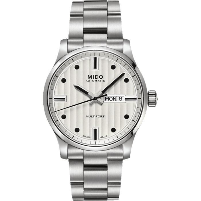 Mido Multifort Классические мужские часы. Необычный гильошированный циферблат притягивает внимание. Надёжный механизм может показать не только стандартное время, но и день недели с числом в специальном окошке на отметке "3" часов. Данная модель станет верным спутником на Вашем запястье.