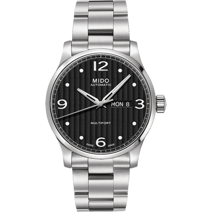 Mido Multifort Классические мужские часы. Необычный гильошированный циферблат притягивает внимание. Надёжный механизм может показать не только стандартное время, но и день недели с числом в специальном окошке на отметке "3" часов. Данная модель станет верным спутником на Вашем запястье.