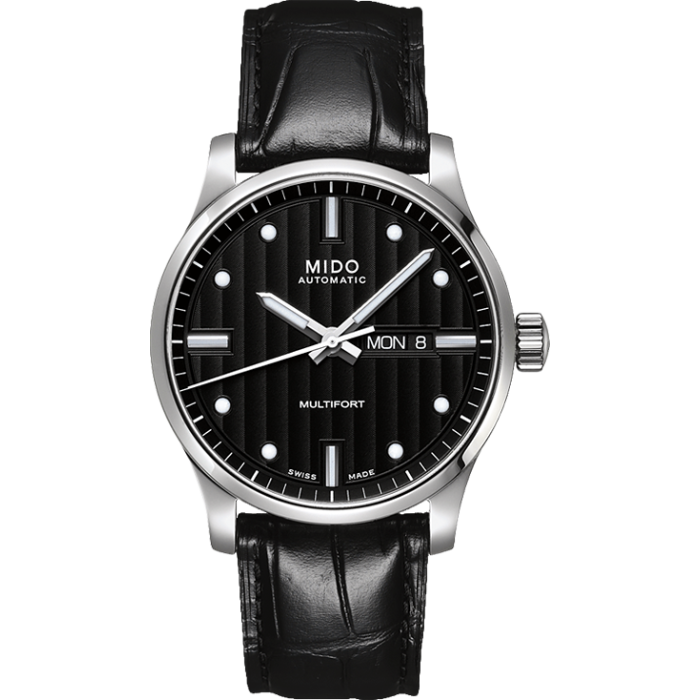 Mido Multifort Классические мужские часы. Необычный гильошированный циферблат притягивает внимание. Надёжный механизм может показать не только стандартное время, но и день недели с числом в специальном окошке на отметке "3" часов. Данная модель станет верным спутником на Вашем запястье.