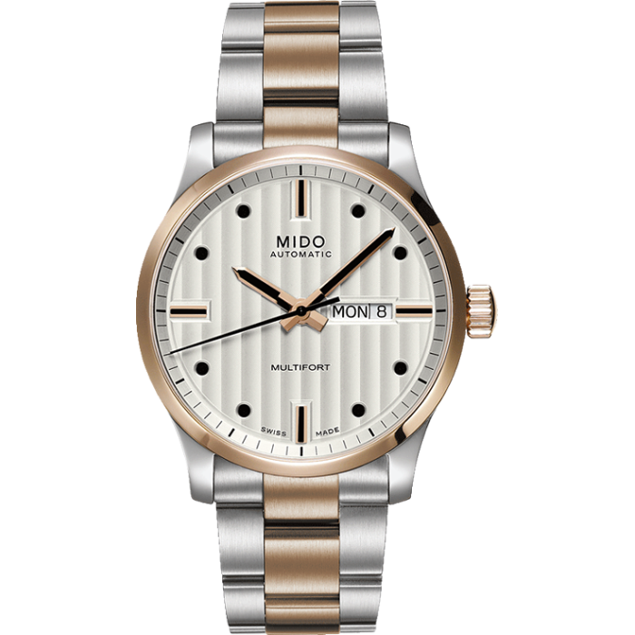 Mido Multifort Классические мужские часы. Необычный гильошированный циферблат притягивает внимание. Надёжный механизм может показать не только стандартное время, но и день недели с числом в специальном окошке на отметке "3" часов. Данная модель станет верным спутником на Вашем запястье.