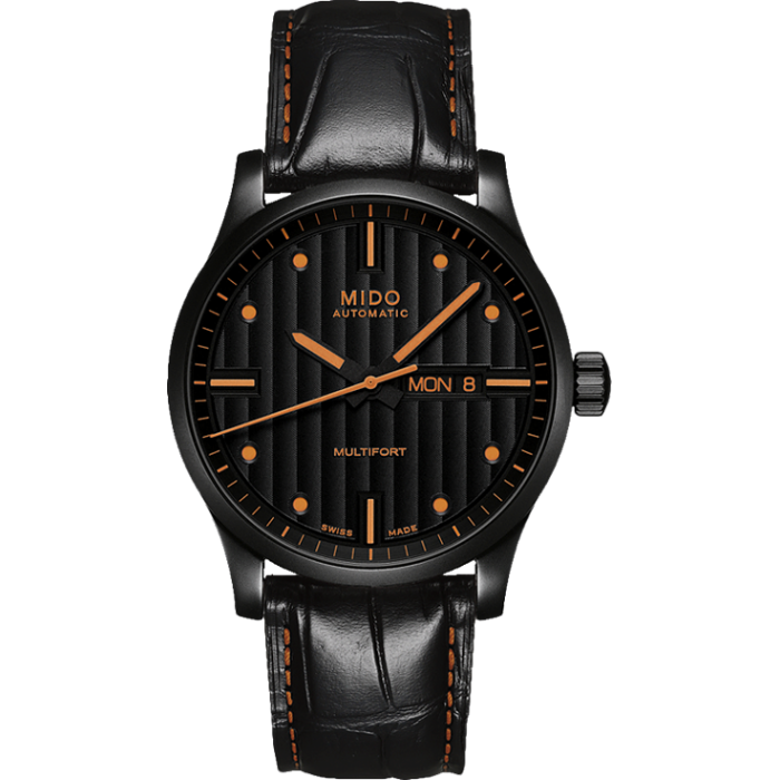 Mido Multifort Special Edition Классические мужские часы, выполненные в сочетании 2 цветов: чёрного и оранжевого. Необычный гильошированный циферблат притягивает внимание. Надёжный механизм может показать не только стандартное время, но и день недели с числом в специальном окошке на отметке "3" часов. Данная модель станет верным спутником на Вашем запястье.