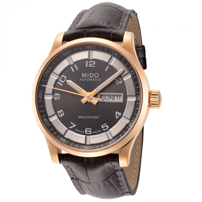 Mido Multifort Классические мужские часы. Необычный циферблат с арабскими цифрами притягивает внимание. Надёжный механизм может показать не только стандартное время, но и день недели с числом в специальном окошке на отметке "3" часов. Данная модель станет верным спутником на Вашем запястье.