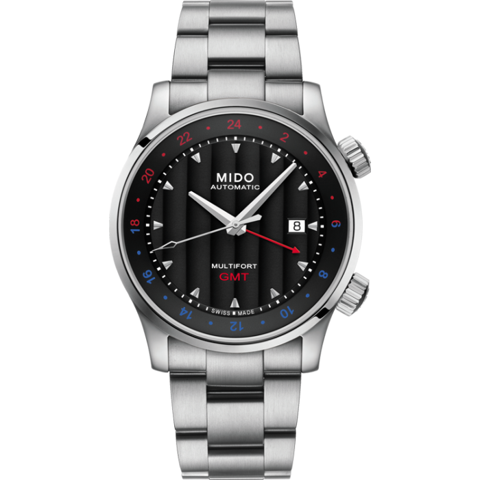 Мужские часы с индикацией времени второго часового пояса, с помощью центральной стрелки и разметки на циферблате. Апертура даты в положении 3 часа.