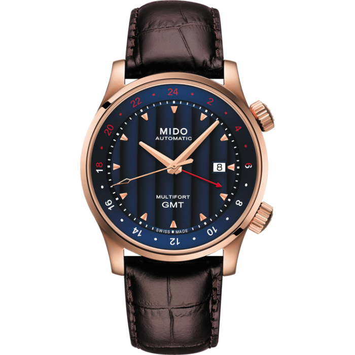 Мужские часы с индикацией времени второго часового пояса, с помощью центральной стрелки и разметки на циферблате. Апертура даты в положении 3 часа.