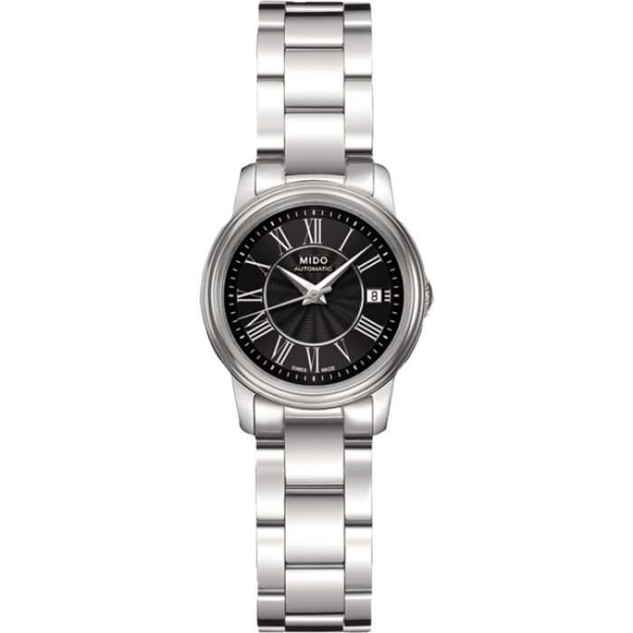 Женские часы. Индикация часов, минут, секунд центральными стрелками. Окошко даты в положении 3 часа. Циферблат украшен узором гильоше.